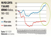 En los últimos 5 años el salario mÃnimo fue aumentado en tres oportunidades: en enero del 2006 subió de 460 a 500 soles mensuales; en enero del 2008, subió a 550 soles mensuales y en febrero del 2011 subió a S/. 600/mes. En total, el salario mÃnimo ha aumentado en 30%, bastante menos que el PBI en el mismo periodo.